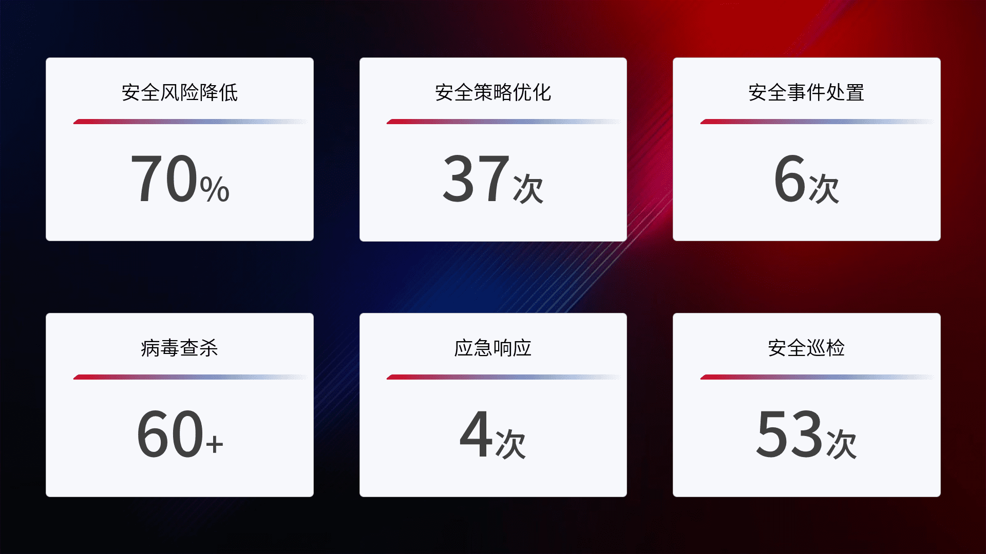 提供全面的安全事件报告体系,,,,包括处置报告、、周报、、、季度和年度总结,,,结合持续监控,,,,帮助客户深入了解网络安全状况。。。。